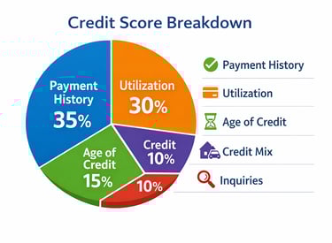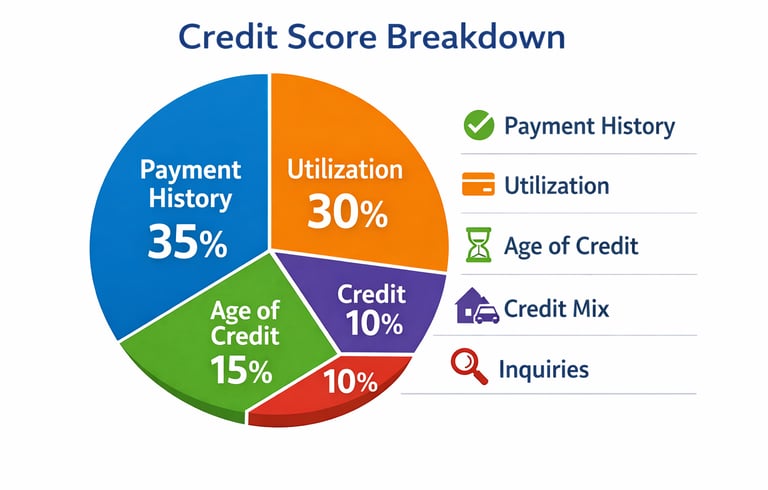 FactorFICO (Typical)VantageScore 4.0NotesPayment History~35%~41%Most important factor in bothCredit Utilization~30%~20%Balances relative to limitsCredit Age / Depth~15%~20%Age of accounts and depth of fileNew Credit~10%~11%Recent applications and inquiriesCredit Mix~10%Included in depthVariety of account types